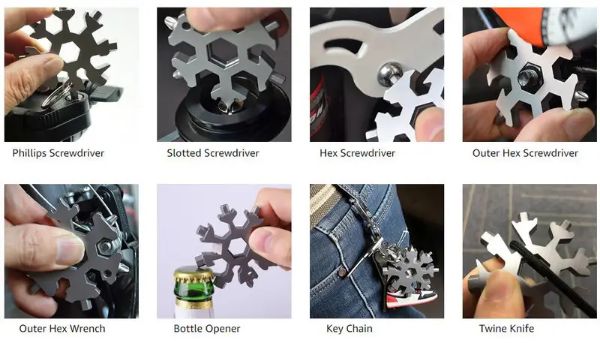 MULTIFLAKE Werkzeug kann verwendet werden, um die Bierflasche zu öffnen, die Schraube zu drehen, Snowboards, Fahrrad, Spielzeug und mehr zu reparieren.