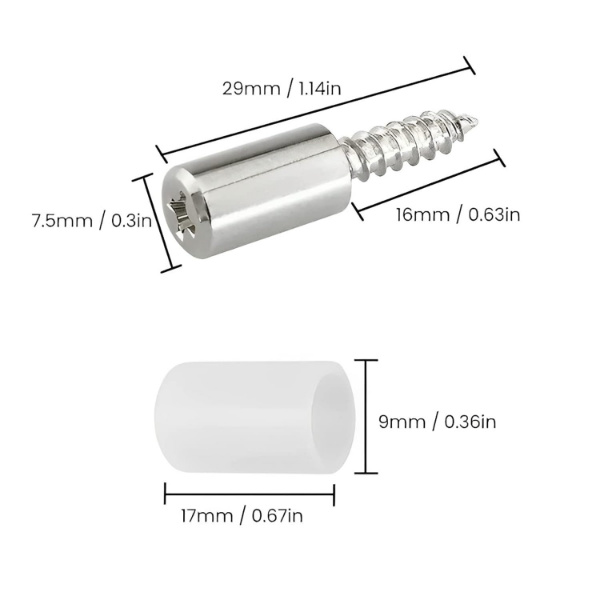 Abmessungen: Schraube: 24 x 7 x 12 mm, Silikonkappe: 15 x 9 mm