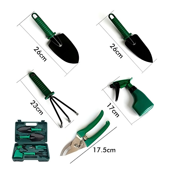 1 x Gartenwerkzeug-Set mit Aufbewahrungsbox: 1 x Unkrautstecher/Rechen, 2 x Pflanzlöffel, 1 x Baumschere, 1 x Zerstäuber.