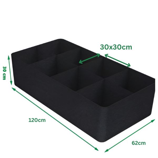 Dieses Hochbeet aus Stoff hat ein Design mit 8 Gittern in den Maßen 120 x 62 cm und einer Höhe von 30 cm.