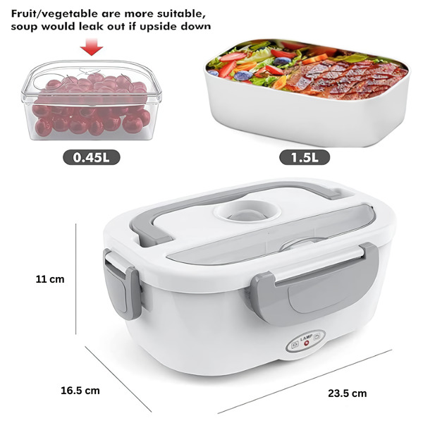 Dieser beheizte Lunch-Behälter enthält zwei herausnehmbare 1,5-Liter-Behälter und einen 0,45-Liter-Kunststoffbehälter, die austauschbar verwendet werden können.