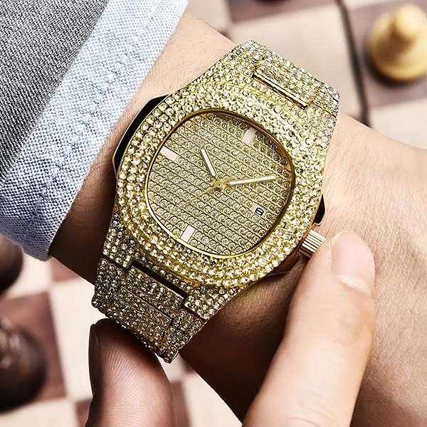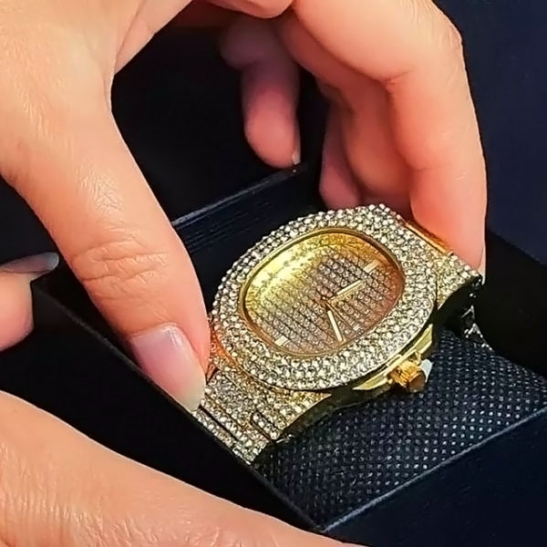 Tausende von schimmernden Kristallen machen diese Uhr zu einem echten Hingucker. Sie ist nicht nur ein Zeitmesser – sie ist ein kühnes Statement für Luxus und Eleganz.