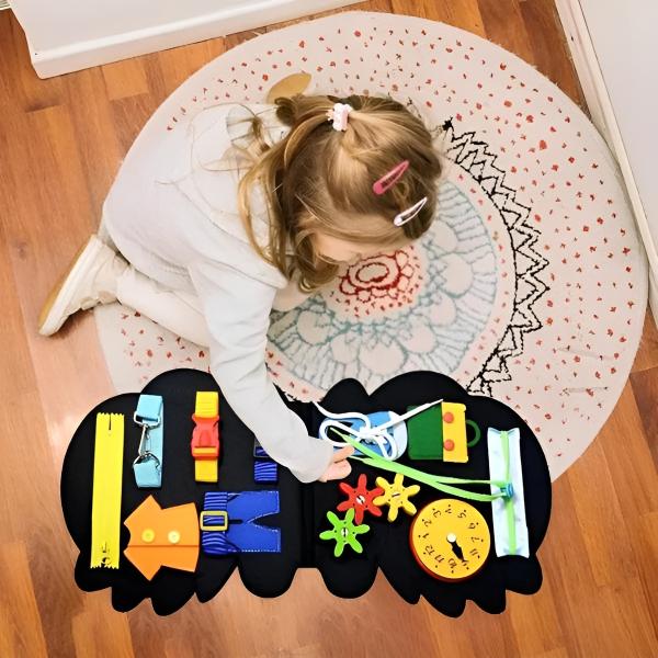Das Kleinkind wird sich mit Reißverschlüssen, Verschlüssen, Zahnrädern, Uhren, Schnürsenkeln und vielem mehr beschäftigen