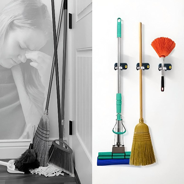 🧹 Halten Sie Ihren Raum ordentlich und aufgeräumt mit unserem Set aus 3 vielseitigen Haltern! Perfekt für die Organisation von Mopps, Besen und mehr in Haus, Garage oder Garten. 🚪🧺