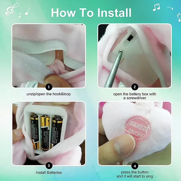 Das Batteriefach ist über eine Klettverschlussöffnung auf der Rückseite des Spielzeugs leicht zugänglich. Drehen Sie den Schalter auf „ON“, und die Magie beginnt. Roxy ist aus hochwertigen Materialien hergestellt, die weich, langlebig und sicher für Kinder sind.